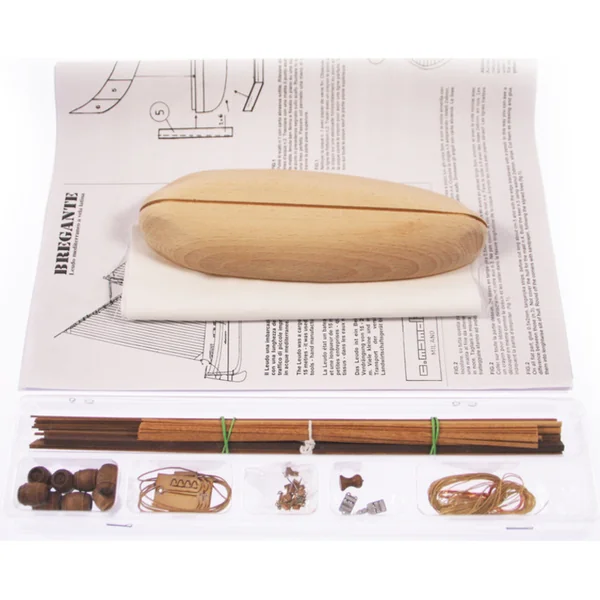 Modèle de bateau Bregante, de la série Mini Mamoli, à l’échelle 1:72. Modèle adapté aux débutants en modélisme. Le kit contient des pièces en bois découpées, des pièces métalliques, un support et un manuel. Le Bregante était un bateau de charge avec un déplacement de 15 à 20 tonnes et une longueur de coque d’environ 15 mètres – il était principalement utilisé par de petits commerçants en Méditerranée pour le transport de marchandises métallurgiques, d’outils agricoles, de produits artisanaux, de tissus, etc.