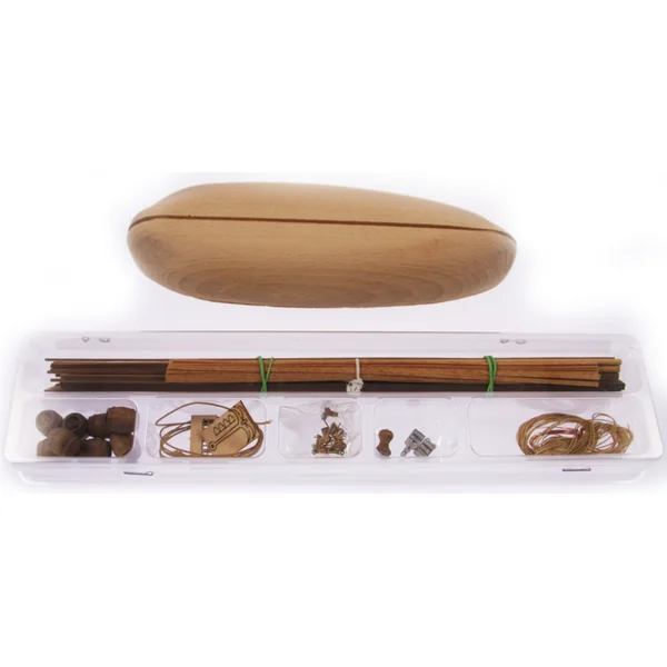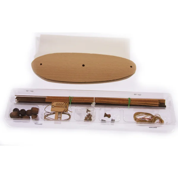 L’emballage contient un semi-fini de coque, des pièces en contreplaqué, des lattes en bois, un blister avec de petites pièces, un ensemble de dessins et un manuel SK.