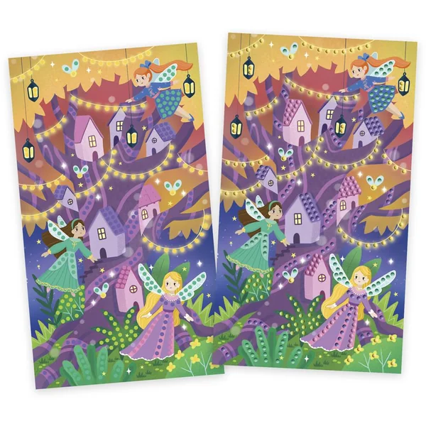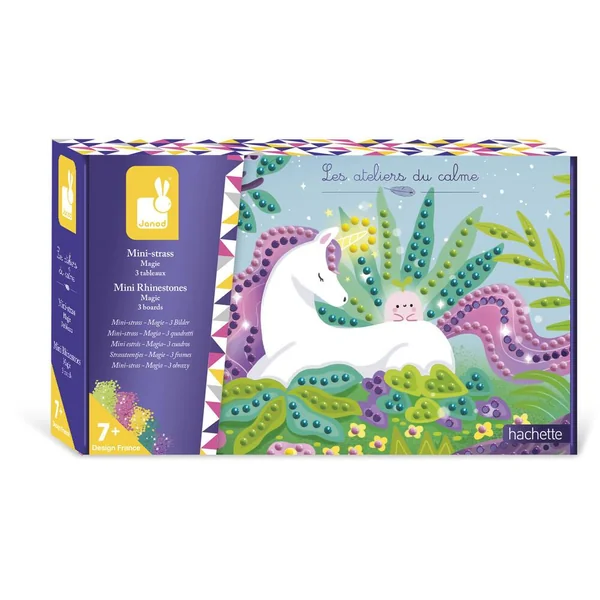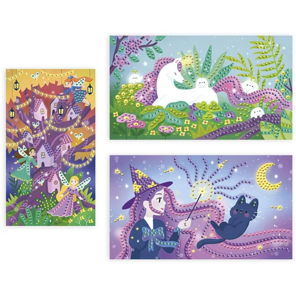Ce kit créatif se compose de 3 tableaux à décorer avec des mini strass. Il suffit de décoller les parties autocollantes et d’appliquer les strass à l’aide du stylet et du carré de gomme inclus, en suivant les étapes indiquées dans le livret.