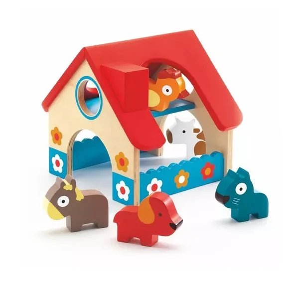 Une petite ferme en bois joliment décorée qui abrite 5 animaux : un chien, un chat, un cheval, une vache et une poule. Un jouet d’éveil idéal pour stimuler l’imagination… dès 18 mois.