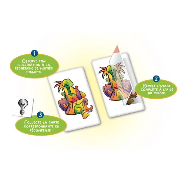Découvrez qui vous attend de l’autre côté du miroir ! Transformez les moitiés d’image en un tout à l’aide des cartes miroirs : une ligne courbe se révèle être une aubergine, et un drôle de gribouillis est en fait un palmier géant.