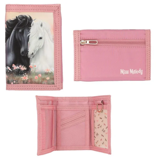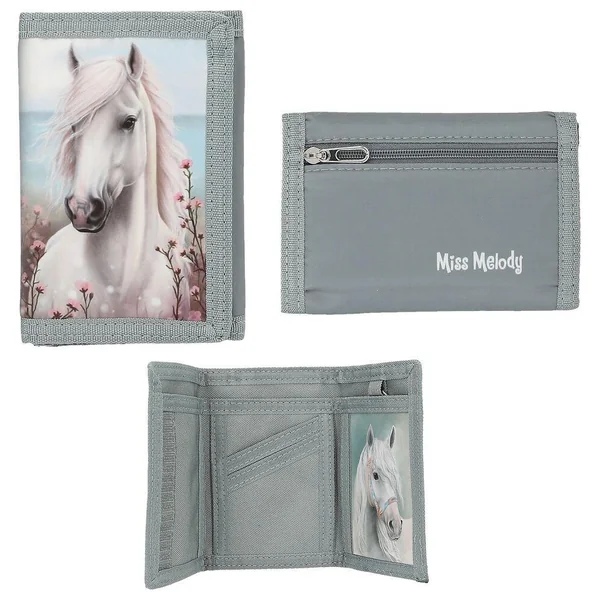 Miss Melody Pochette Pour les fans de chevaux ! Les porte-monnaies Miss Melody avec fermeture velcro sont disponibles en trois modèles : couleur sauge avec cheval blanc et fleurs ; rose avec un cheval noir et un cheval blanc ; bleu avec cheval marron. À l’intérieur se trouvent un anneau pour clés ainsi que des compartiments pour les billets, les cartes et une carte nominative, l’extérieur est muni d’un compartiment à fermeture éclair pour la monnaie. Matière : 100 pour cent polyester.