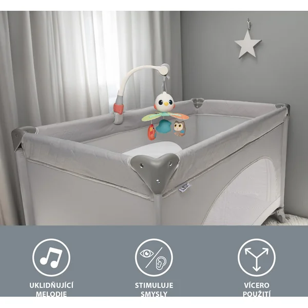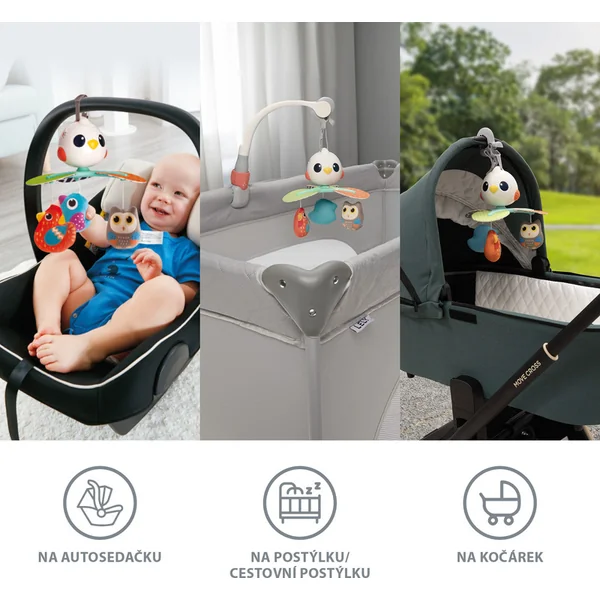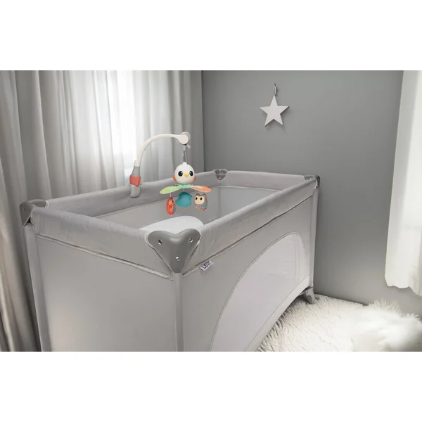 Avec un design hautement flexible, le mobile peut être facilement fixé à un siège auto, un berceau ou une poussette. Il vous offre un maximum de confort lors de l’installation et la possibilité de le placer où cela est nécessaire, que vous soyez à la maison ou en déplacement.