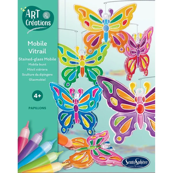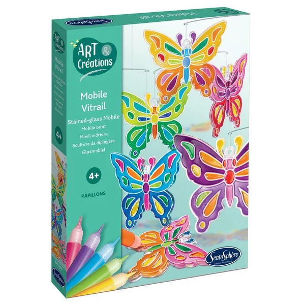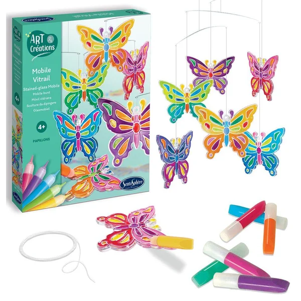L’enfant réalisera, grâce à ce kit, des éléments en vitrail en injectant les couleurs de son choix dans les éléments décoratifs sertis. Après quelques heures, les pièces seront sèches et cristallines, prêtes à être suspendues en mobile avant de tournoyer et de flamboyer de mille reflets.