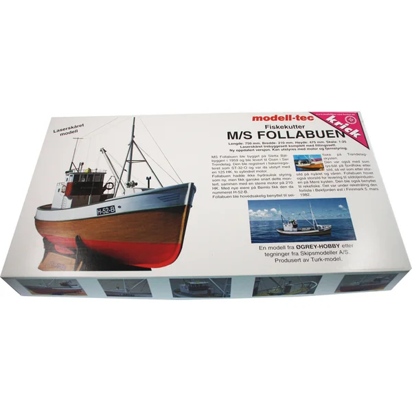 Kit de modélisme de bateau Modell-Tec MS MS Follabuen 1:25, avec de nombreux détails et une construction robuste. Ce bateau de pêche norvégien peut être assemblé comme un modèle non flottant, ou vous pouvez l’équiper d’un équipement RC et le mettre à l’eau comme un modèle réduit télécommandé du bateau MS Follabuen.