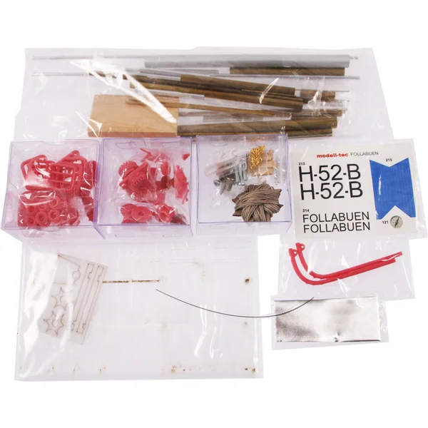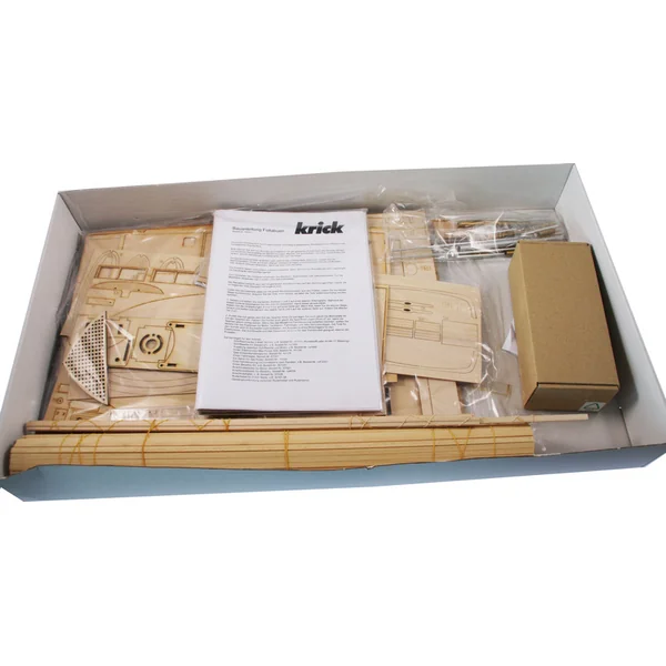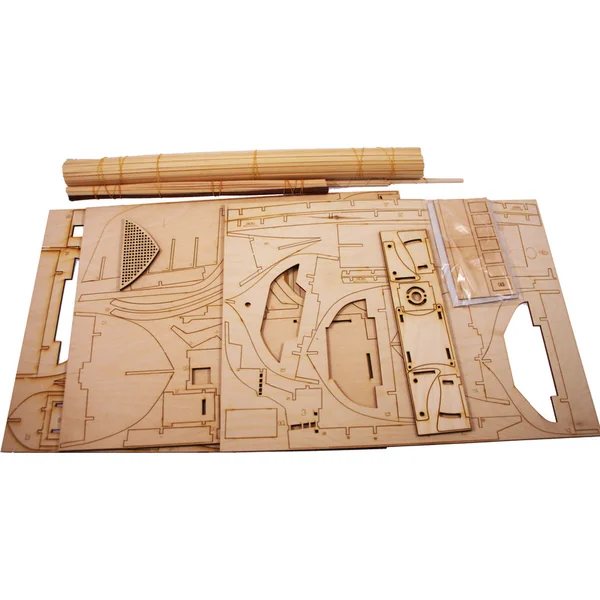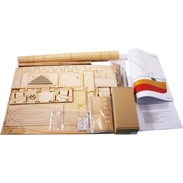 L’emballage contient un ensemble de pièces en contreplaqué, un ensemble de baguettes en bois de différentes sections, un blister avec de petites pièces, des pièces en laiton, un ensemble de dessins et un manuel multilingue.