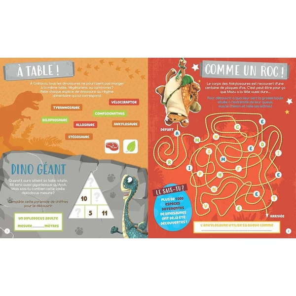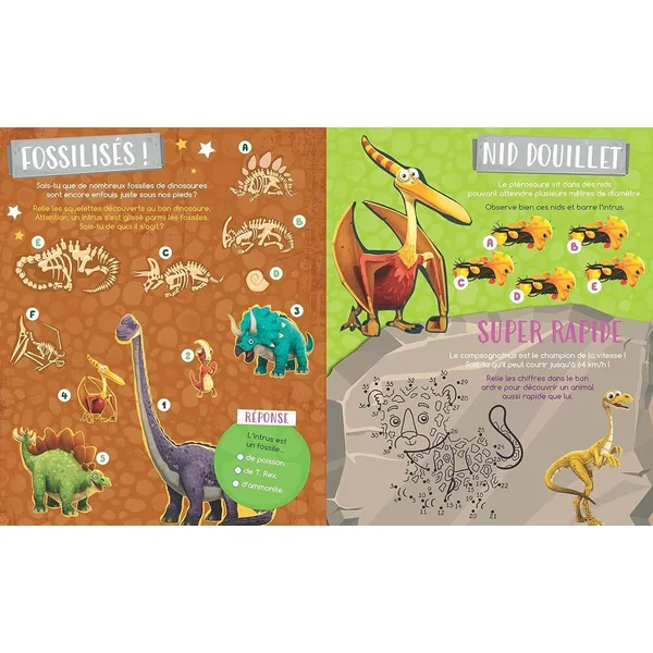 Un ouvrage broché de 80 pages qui renferme toutes sortes de quiz et de jeux (des points à relier, des coloriages magiques, des cherche et trouve, des labyrinthes à résoudre, des jeux des différences, de ressemblances, d’anomalies, d’intrus…) et dont la résolution permet d’apprendre à chaque fois une nouvelle connaissance sur les dinosaures.Un ouvrage pour faire le plein à la fois d’activités et d’apprentissages aux côtés de tous les héros de la série Gigantosaurus !