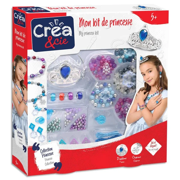 - Avec de nombreux accessoires dont : 1 diadème (ou tiare), 1 bague, 7 charms (breloques), plus de 300 perles, 2 paires de boucles d’oreilles clips, 2 fermoirs, des cordons et 1 outil.