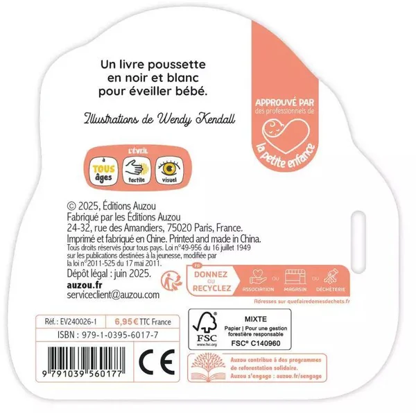 Les illustrations contrastées permettent un éveil visuel dès la naissance, et les pages en mousse colorées (accessibles à travers de petites découpes présentent sur chaque page) participent à l’éveil tactile de bébé.