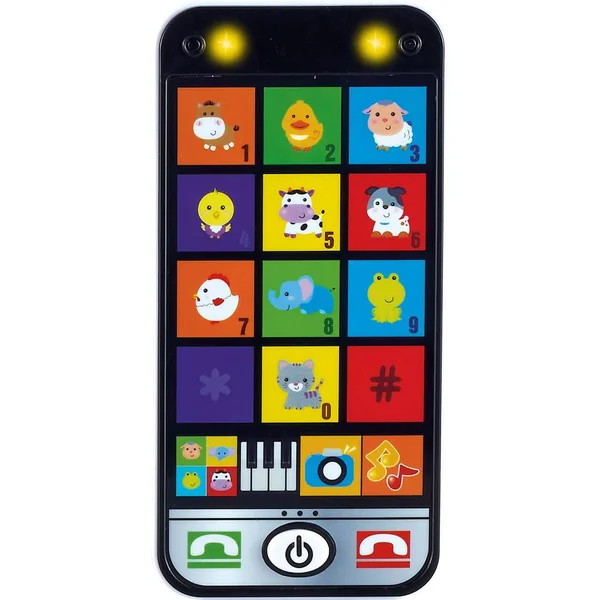 Ce téléphone en plastique pour bébé présente un écran avec des touches de couleur. Elles représentent des animaux, des objets, des symboles identiques aux claviers d’un téléphone portable. Cet appareil pour enfant offre une dizaine de mélodies et de sons d’animaux, des lumières et 4 modes de jeu. Il est doté d’un bouton on/off et est fourni avec des piles.