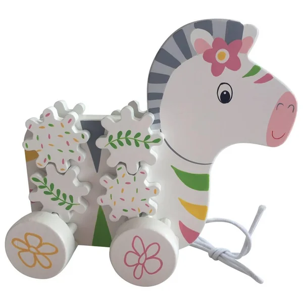 Quand l’enfant tire le zèbre en bois les engrenages tournent. Engrenages non détachables. Ce jouet permet de développer la motricité et l’éveil des sens.