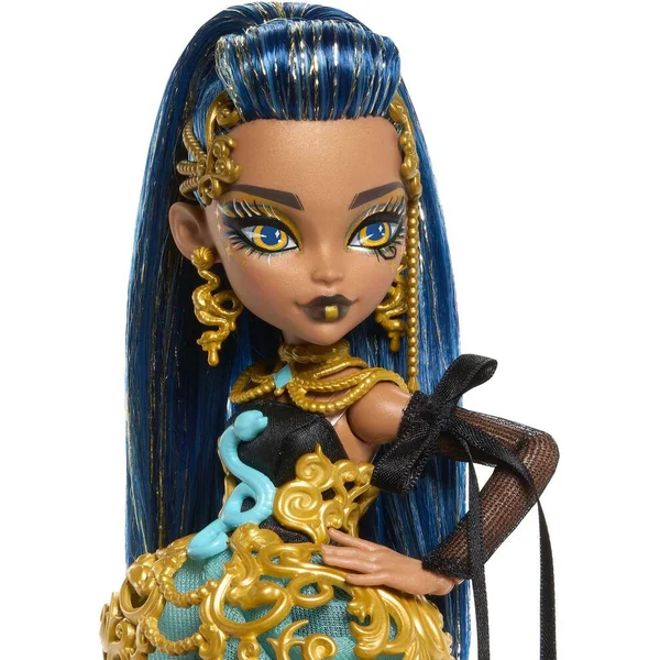 Cleo rejoint la soirée d’anniversaire ! La poupée, articulée en 11 points, porte des bijoux et une robe or et turquoise avec 7 accessoires de fête.