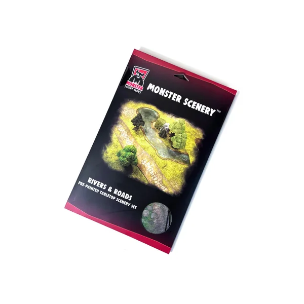 Monster Scenery – Rivers & Roads contient cinq gabarits en néoprène robuste, double-face. Chaque pièce montre un sentier rocailleux menant au cœur des sombres forêts ou une rivière rapide se terminant dans un étang arrondi, ajoutant du terrain difficile à franchir pour les batailles ou menant à des trésors mystérieux.