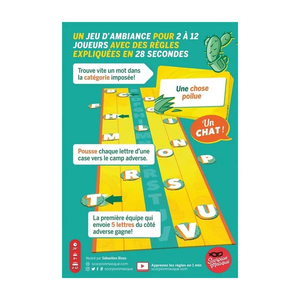 Deux équipes s’affrontent. Balancez 5 lettres (cactus) dans le camp adverse pour gagner. À votre tour, trouvez vite un mot correspondant à la catégorie imposée et poussez chaque lettre d’une colonne.