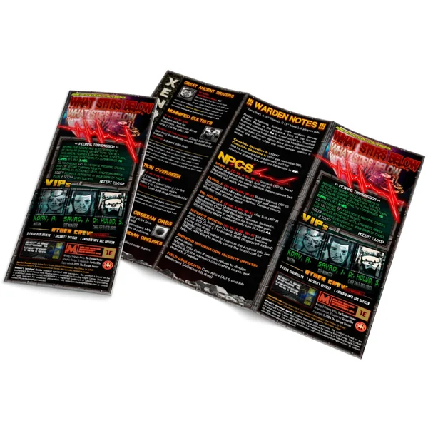 What Stirs Below est une aventure de jeu de rôle de science-fiction horrifique conçue pour des parties de 3 à 5 heures. Présentée sous forme de dépliant en triptyque recto verso (format US Letter 21,6 × 27,9 cm), elle est rapide à prendre en main et propose :