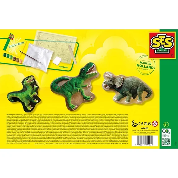 Vous pouvez facilement créer neuf dinosaures différents en mélangeant du plâtre avec de l’eau et en versant dans le moule. Une fois que le plâtre est dur, vous pouvez commencer à peindre les dinosaures en six couleurs différentes. Allez-vous commencer par le T-Rex, le Stégosaure ou par exemple le Tricératops ? Peignez-les tous et votre monde de dinosaures sera complet !