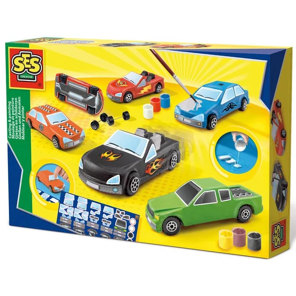 Avec ce kit SES, tu peux réaliser de super voitures en plâtre qui peuvent rouler pour de vrai ! Verse le plâtre dans le moule, ajoute les roues, puis laisse sécher. Tu peux ensuite peindre les voitures avec tes couleurs préférées. Ajoute des autocollants pour parfaire ta création.