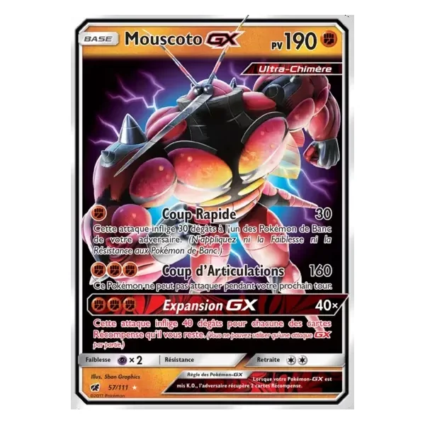 Découvrez Mouscoto (cin057), une carte Pokémon de l’extension Invasion Carmin, provenant du bloc Soleil & Lune. Idéale pour compléter votre collection, cette carte Ultra Rare plaira autant aux collectionneurs qu’aux joueurs.