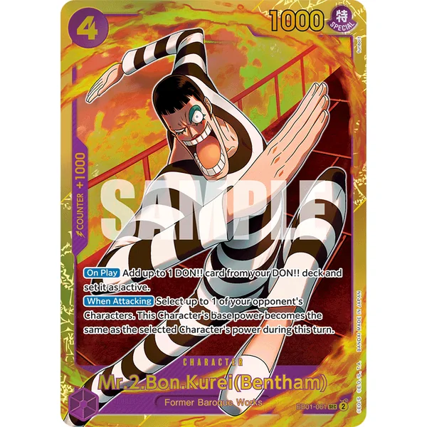 Découvrez Mr.2.Bon.Kurei (eb01061), une carte Secrète Rare de l’extension Memorial Collection. Idéale pour compléter votre collection, cette carte Secrète Rare plaira autant aux collectionneurs qu’aux joueurs.