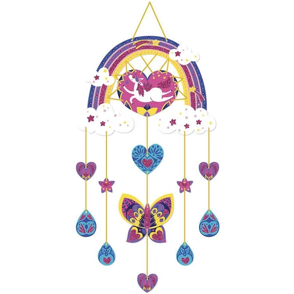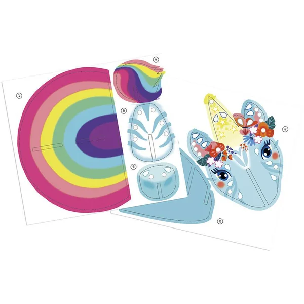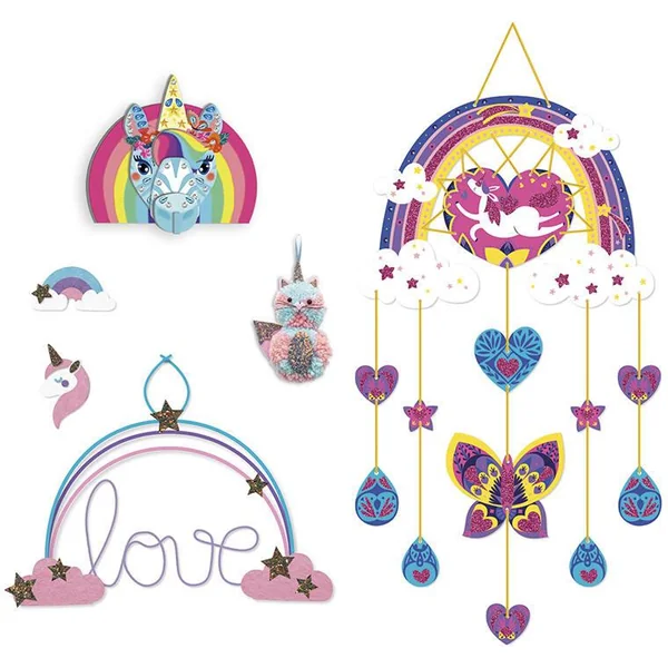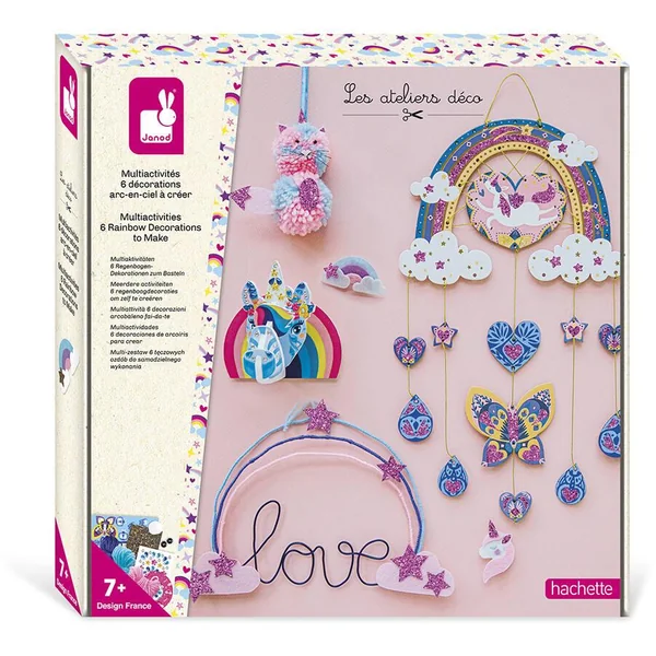 Embarquez dans le monde merveilleux des licornes, des paillettes et des arcs- en-ciel ! Ce coffret créatif se compose de 6 décorations et accessoires de mode à confectionner ! Un trophée licorne à assembler, un attrape-rêves, 2 broches, un pompon caticorn et un arc-en-ciel en fil de fer et coton à suspendre. Chaque réalisation permet d’utiliser une technique différente. Le livret pas à pas détaillé et illustré permettra d’obtenir un résultat parfait pour tous les enfants. Ce coffret permet de développer la motricité fine, la patience et la créativité. Il faut compter environ 6h au total pour réaliser ces 6 décorations.