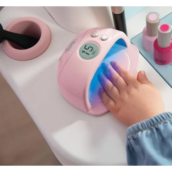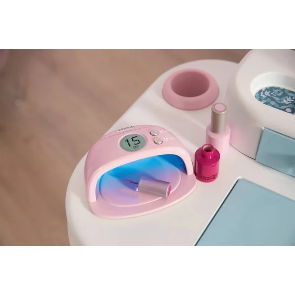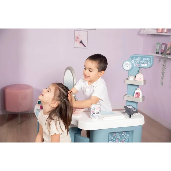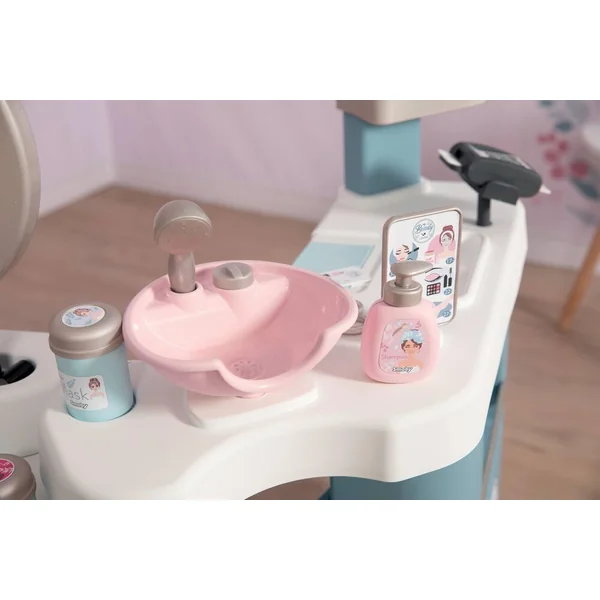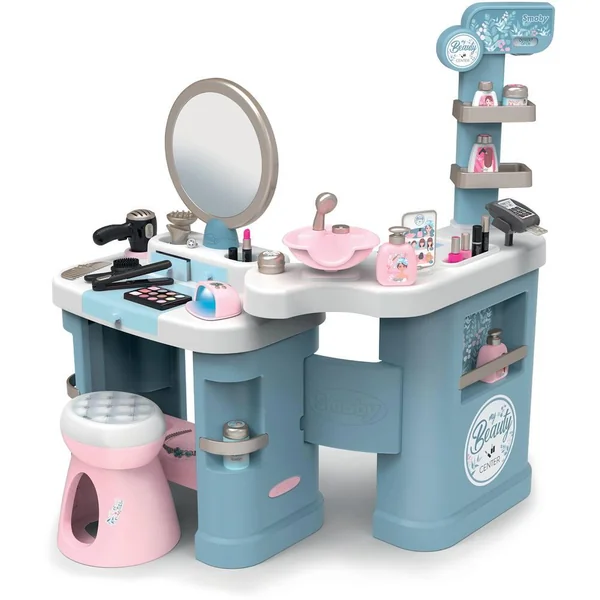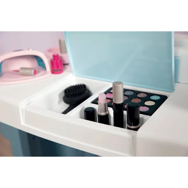 Institut de beauté regroupant 3 univers : coiffure, onglerie, maquillage. L’enfant peut alors se mettre dans la peau d’un maquilleur, d’un coiffeur et d’un vendeur. Produit pliable pour un gain de place. 3 zones bien distinctes : coiffeuse, espace shampoing et comptoir marchand. Le premier espace se compose d’une coiffeuse avec 1 tabouret, 1 miroir inclinable vers l’arrière pour l’ajuster à la taille de l’enfant, des zones de rangement, 1 trappe avec différents compartiments de rangement, et des tablettes. L’espace shampoing possède un bac avec une douchette et un bouton avec fonction cric crac. L’espace marchand se compose d’un coin paiement avec TPE et tickets magiques, d’une caisse avec tiroir refermable à clé, d’un panneau d’enseigne mécanique ouvert/fermé et d’un livret montrant les soins proposés dans l’institut et leur prix. Diverses zones pour disposer les produits ouvert/fermé et d’un livret montrant les soins proposés dans l’institut et leur prix. Diverses zones pour disposer les produits à vendre sont également présentes.