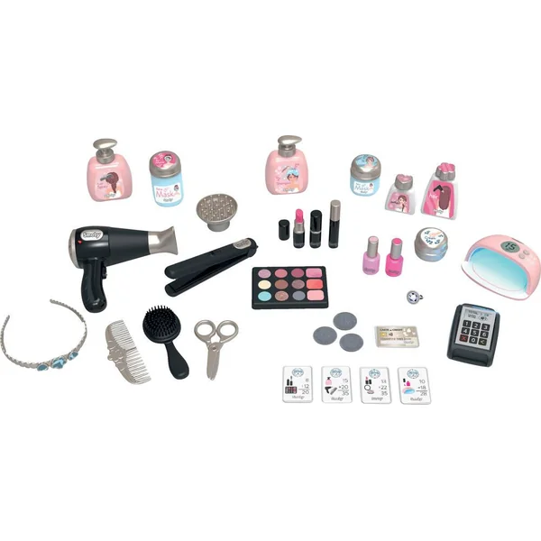 32 accessoires sont inclus : 1 sèche-cheveux avec fonction lumineuse et sonore et 2 embouts différents, 1 paire de ciseaux, 1 lisseur avec fonction mécanique, 1 peigne, 1 brosse, 2 flacons de vernis, 1 fausse lampe UV électronique (fonction sonore et lumière bleue), 1 serre-tête, 1 bague, 1 palette de fards à paupières, 2 rouges à lèvres avec fonction mécanique, 1 mascara, des flacons (petit pot crème, parfum, flacon pousse-gel ), 3 pièces de monnaie, 4 tickets de caisse, 1 carte bancaire.