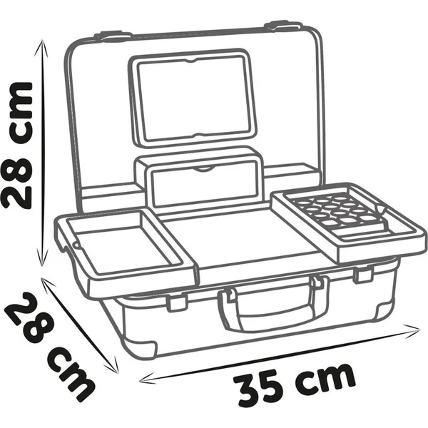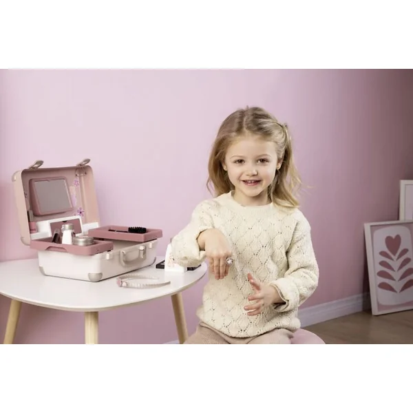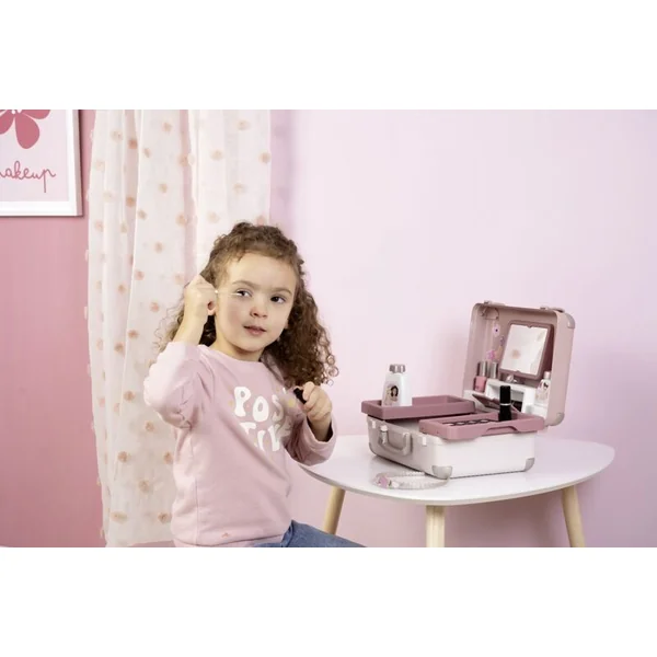 Tous les 13 accessoires (faux cosmétiques pour jouer) se trouvent à l’intérieur de la trousse avec une poignée, qui peut être emportée partout :