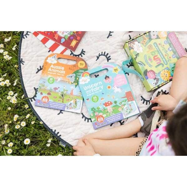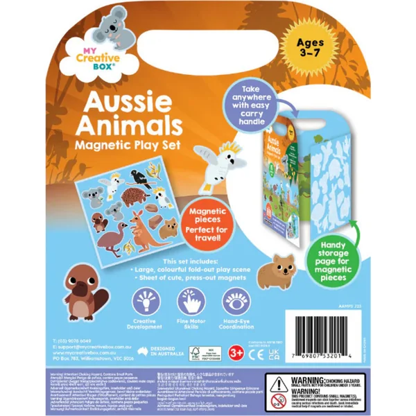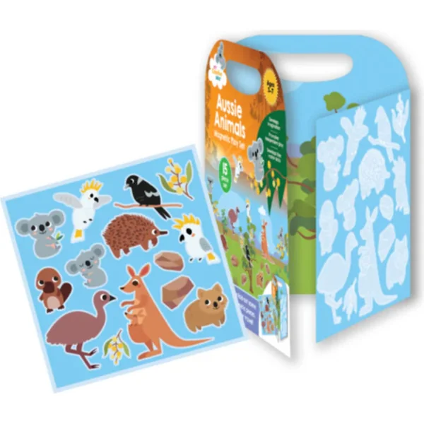 Le set comprend 15 pièces magnétiques, y compris un environnement pliable avec de mignons animaux australiens illustrés par un artiste local. Il est destiné aux enfants de 3 à 7 ans et offre des heures de créativité, que ce soit à la maison ou en voyage.