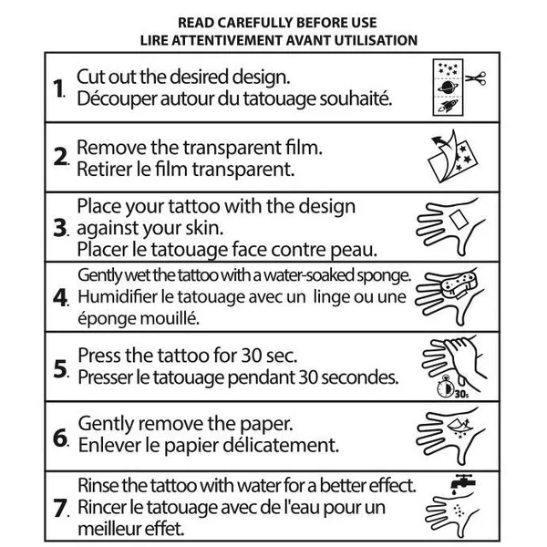 Utilisation facile et rapide : pressez le tatouage contre votre peau pendant 30 secondes à l’aide d’un linge humide, et tada !