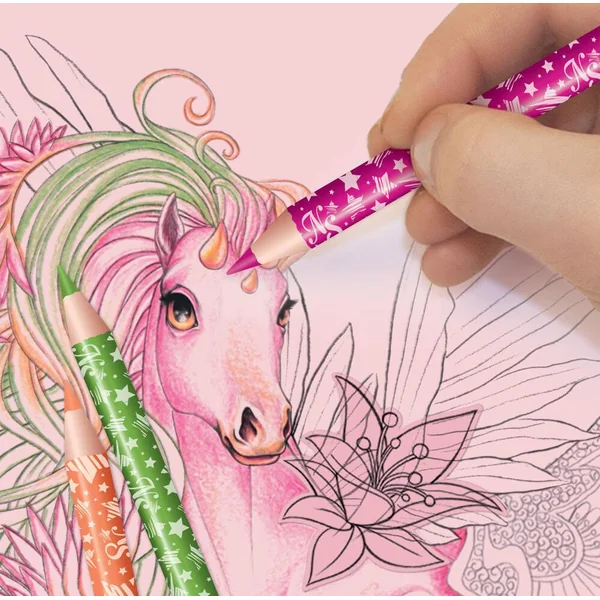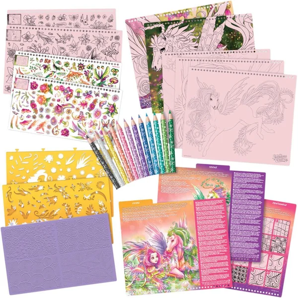 Créez des chevaux fantastiques mystiques et époustouflants, dignes de voler dans les cieux magiques de la nébuleuse argentée ! Utilisez un large choix d’autocollants, de pochoirs et de techniques pour concevoir les chevaux de Petulia et Hazelia. Avec 35 pages à dessiner, 80 pochoirs, des autocollants, des crayons de couleur et autres accessoires pour dessiner le cheval mystique de tes rêves.