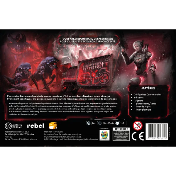 Avec Nemesis Carnomorphes, faites face à un nouveau type de créatures : les Carnomorphes. S’adaptant rapidement à leur environnement et dévorant tout ce qu’ils trouvent, ce sont des adversaires plus redoutables que les Intrus. Pour réussir vos objectifs et survivre, vous devrez faire preuve d’une coopération plus étroite. Quitte à trahir au bon moment, s’il le faut…