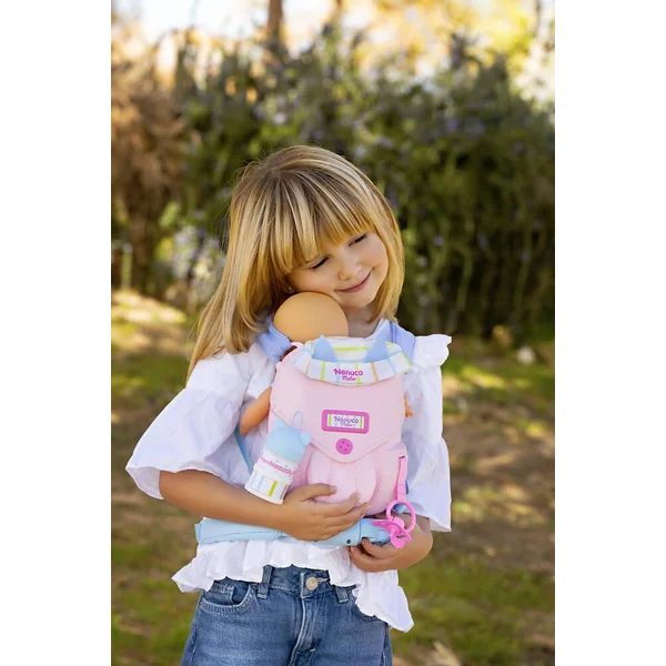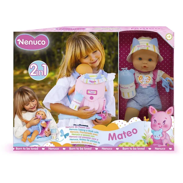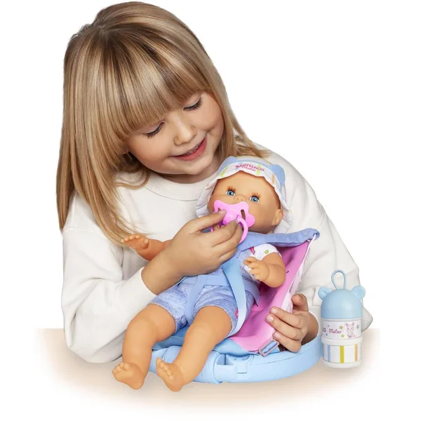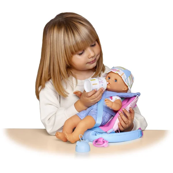 Porte-bébé réglable 2 en 1. Avec sangles et bretelles réglables. Avec rangements pour les accessoires. Mateo mesure 35 cm, poupon au corps souple. 2 accessoires inclus : boîtes doseuses lait et une tétine.