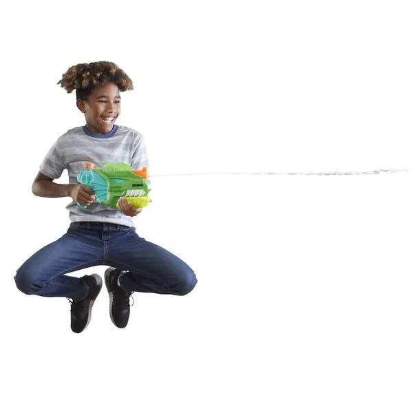 On peut envoyer un déluge d’eau sur ses copains avec le pistolet à eau Nerf Super Soaker Dino Squad Dino-Soak inspiré du dilophosaure ! Le jet d’eau sort de sa gueule ! Il est idéal pour les jeux d’été à l’extérieur et plaira à tout fan de dinosaure, enfant ou adulte. Il est facile à remplir et à utiliser. Il suffit d’ouvrir le bouchon, de remplir le réservoir, puis d’actionner la poignée-glissière d’avant en arrière pour tirer un jet d’eau dino-tastique !