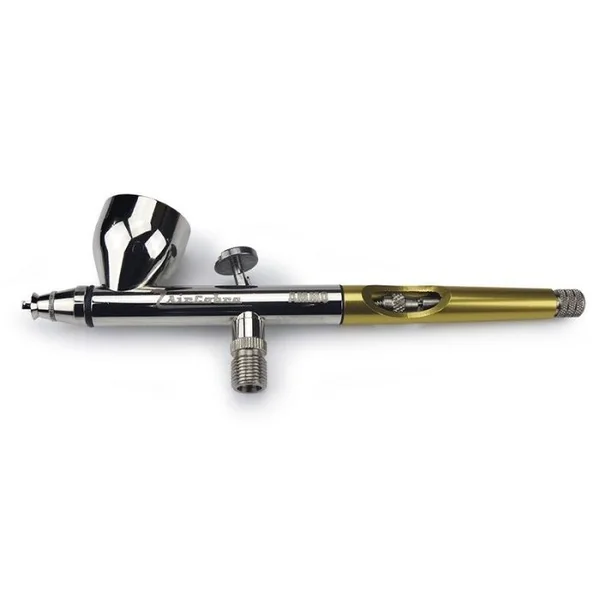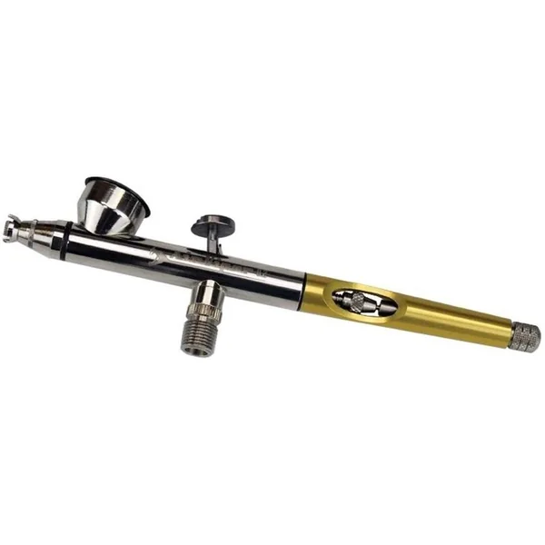 Dans le processus de nettoyage, l’aérographe est fixé sur le support inclus. La tête de la buse est ensuite positionnée de manière à s’insérer dans l’ouverture du contenant en verre. L’excédent de produit de nettoyage sous forme de brouillard est alors projeté directement dans le récipient, permettant un nettoyage efficace et sans dégâts.