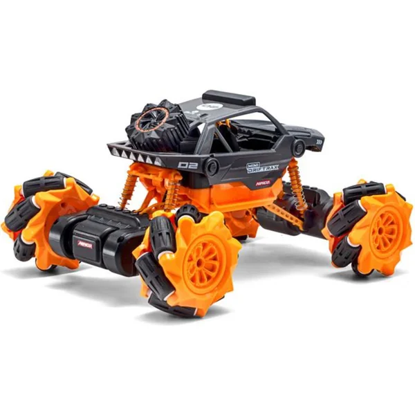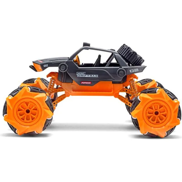 Le jouet RC pour enfants NINCORACERS Mini Driftrax est une voiture télécommandée avec laquelle vous pourrez vous amuser grâce à ses roues à rouleaux. Les roues à rouleaux et la propulsion avec quatre moteurs permettent non seulement de rouler en avant et en arrière, mais aussi de se déplacer perpendiculairement, de tourner en diagonale ou de pivoter sur place. Les roues avant ne sont pas directionnelles, le modèle tourne selon le même principe qu’un tank, par exemple. La voiture dispose d’une suspension fonctionnelle avec des amortisseurs à ressort pour passer sur les irrégularités. Le châssis est de type monster truck dans une couleur orange bien reconnaissable. La carrosserie est soigneusement détaillée avec un cockpit équipé de sièges et d’un volant.