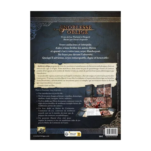 Noblesse Oblige propose de vivre les aventures tumultueuses de héros rocambolesques dans un univers de cape et d’épée. Vous marcherez donc dans les pas de personnages hauts en couleur, comme d’Artagnan ou le Comte de Monte-Cristo au cours de parties tout aussi pittoresques que truculentes.