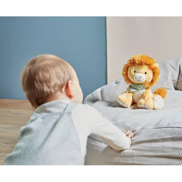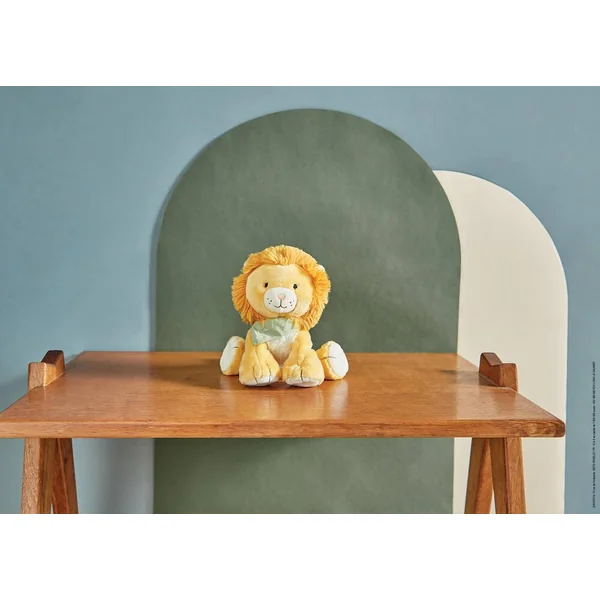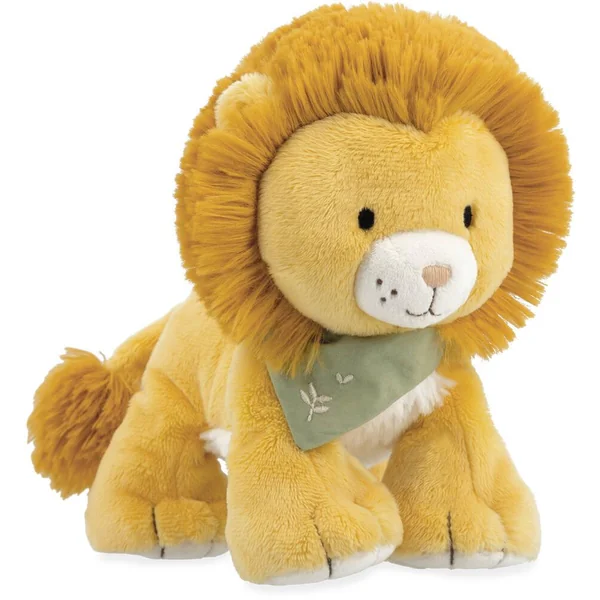 Avec sa belle crinière ultra douce à caresser et coiffer ainsi que sa belle fourrure aux teintes lumineuses, il fera craquer tous les coeurs avec son extrême douceur. Son adorable bouille stimule l’affect et l’empathie de bébé. Son corps très moelleux et ses petites pattes servent de moyens de préhension pour les petites mains. Son nouveau bandana vert, est un rappel de la nature avec une broderie de douces feuilles.