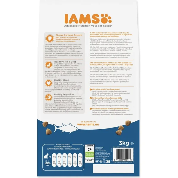 IAMS Pour Vitalité Chat Adulte Thon est une nourriture complète et équilibrée à 100 % qui soutient sept signes de vitalité saine chez les chats adultes. Cette formule avec du thon savoureux et une forte teneur en protéines animales est conçue pour fournir l’énergie nécessaire aux chats tout en leur faisant plaisir.