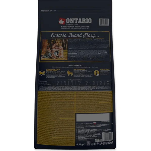 Super premium, aliment complet pour chiens adultes de petites races (à partir de 1 an). Composition : poisson blanc frais (26 %), protéine de poisson blanc déshydratée (23 %), lentilles rouges (11 %), riz brun (9 %), riz cassé (8 %), graisse de volaille (conservée avec des tocophérols naturels) (7 %), pulpe de betterave séchée (3 %), foie hydrolysé (2,5 %), levures, protéine de pois, racine de chicorée séchée (2 %), graines de lin (1 %), minéraux, huile de saumon (0,5 %), extrait de yucca schidigera (0,5 %), chlorure de choline (0,2 %), mélange d’herbes séchées et d’extraits végétaux 0,15 % (0,1 % de thym, romarin et persil séchés), 0,05 % d’Ontario VitalAge BlendTM (extraits végétaux de pamplemousse, curcuma, clous de girofle et romarin), mannan-oligosaccharides (Active MOS 0,1 %), sulfate de chondroïtine (270 mg/kg), sulfate de glucosamine (200 mg/kg), Lacticaseibacillus paracasei HA – 108 inactivé (7,5 x 10^9 cellules/kg). Composants analytiques : matières azotées 30 %, teneur en matières grasses 17 %, cendres 8 %, fibres 2,5 %, calcium 1,3 %, phosphore 0,9 %, acides gras oméga-6 2,4 %, acides gras oméga-3 1,4 %, humidité 8 %. Additifs : Additifs nutritionnels par 1 kg : vitamine A 18 000 UI, vitamine D3 1 500 UI, vitamine E 500 mg, zinc (sous forme de monohydrate de sulfate de zinc) 95 mg, fer (sous forme de monohydrate de sulfate ferreux) 100 mg, manganèse (sous forme d’oxyde de manganèse) 40 mg, cuivre (sous forme de pentahydrate de sulfate de cuivre) 10 mg, iode (sous forme de iodate de calcium anhydre) 2 mg, sélénium (sous forme de sélénite de sodium) 0,2 mg, sulfate de chondroïtine 270 mg, sulfate de glucosamine 200 mg. Additifs technologiques : contient des antioxydants naturels (extraits de tocophérol). UI = unités internationales. Énergie métabolisable : 3 901 kcal/kg. Mode d’emploi : Nourrissez avec des granulés secs ou légèrement humidifiés. Assurez-vous que le chien a toujours accès à de l’eau potable fraîche. Les besoins nutritionnels quotidiens du chien peuvent varier en fonction de son environnement, de sa taille, de son âge et de son niveau d’activité. La ration quotidienne recommandée est indiquée dans le guide d’alimentation. Donnez 1 à 2 rations par jour. Commencez par donner la quantité quotidienne mentionnée ci-dessus, puis ajustez-la pour que le chien maintienne un poids approprié. Pour maintenir une bonne condition physique, assurez-vous que le chien a suffisamment d’exercice et ne consomme pas une quantité excessive de nourriture. Lors de l’introduction d’un nouvel aliment, effectuez les changements progressivement sur 7 à 10 jours et augmentez progressivement la quantité de nouvel aliment chaque jour. La recette Ontario est conçue pour répondre aux besoins nutritionnels des chiens adultes de petites races, conformément aux recommandations de la fédération européenne FEDIAF. La forme et la couleur de chaque granulé peuvent légèrement varier. Conservez dans un endroit frais et sec et protégez de la lumière directe du soleil. À utiliser jusqu’au/ Numéro de lot/ Numéro d’enregistrement du fabricant/ Numéro d’enregistrement à l’exportation du fabricant : imprimé au dos de l’emballage. Fabriqué en République tchèque.
