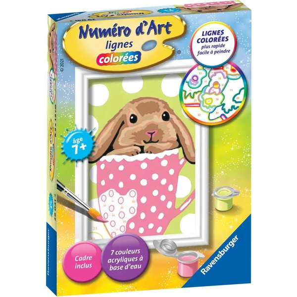 C’est facile, beau et amusant de peindre par numéro grâce aux lignes colorées pré-peintes ! Parmi les 15 visuels minis formats à peindre et à accrocher, ce petit lapin caché dans sa tasse saura ravir les enfants et compléter leur collection.
