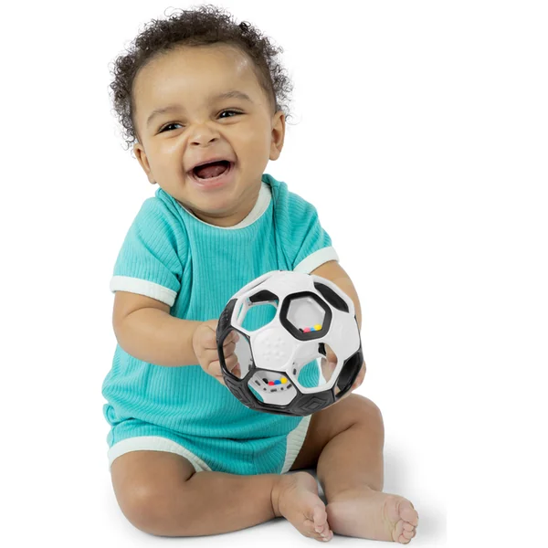 Préparer, saisir, marquer. La balle Grippin’ Goals Rattle Ball, fabriquée avec la technologie flexible et durable Oball de Bright Starts, a un design simple avec de nombreux trous pour les doigts, permettant même aux étoiles du football les moins expérimentées de la saisir.