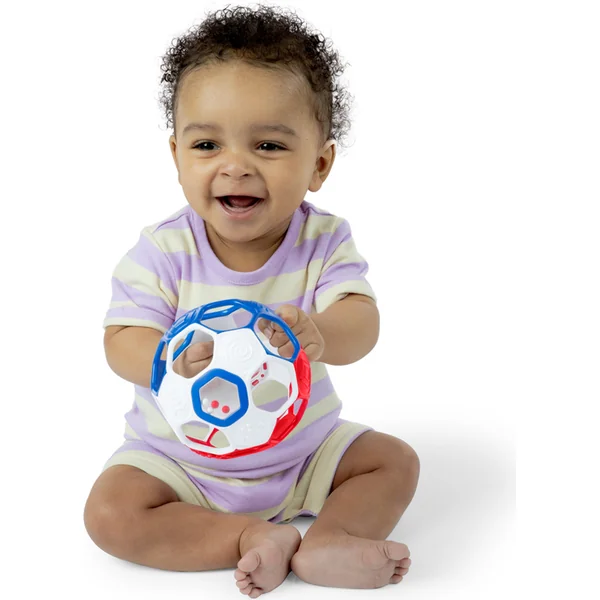TECHNOLOGIE OBALL RÉCOMPENSÉE : La technologie flexible et durable de Bright Starts possède un grand nombre de trous pour les doigts et des détails intégrés pour une prise en main facile de la balle Grippin Goals.