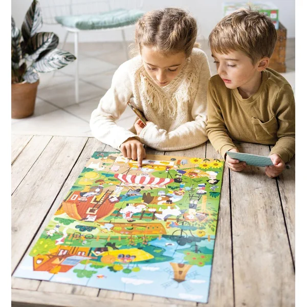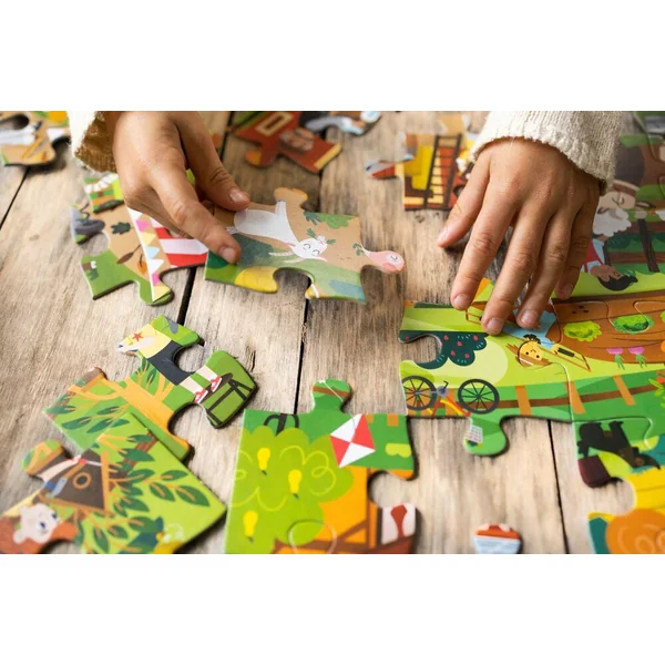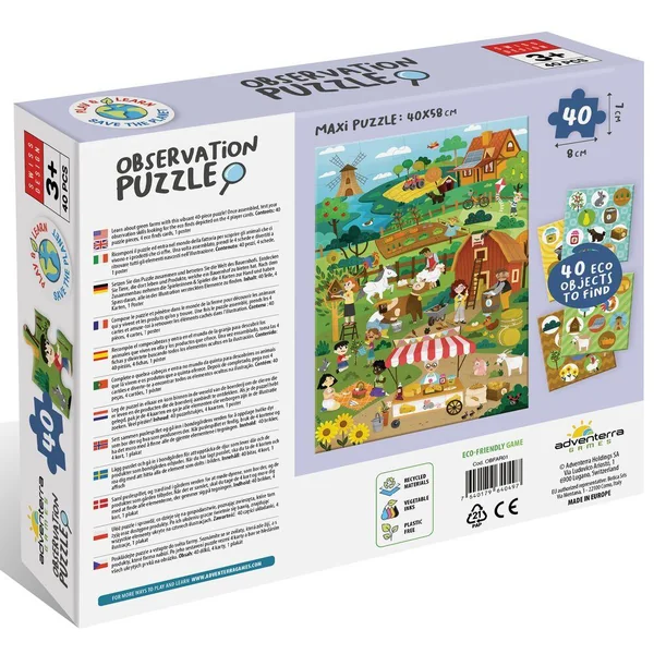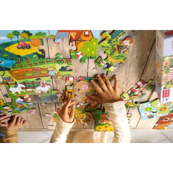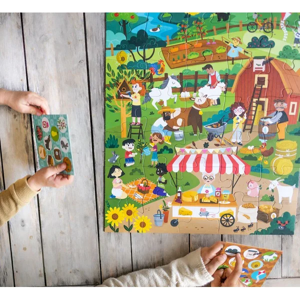 Un grand puzzle composé de 40 pièces, afin d’initier les jeunes enfants au monde de la ferme. Une fois le puzzle assemblé, l’enfant s’amuse à retrouver les 40 éléments qui figurent sur les 4 cartes. Une manière originale de faire découvrir aux enfants les animaux de la ferme et les produits de la nature. À l’intérieur de la boîte, en plus des pièces du puzzle, ils trouveront un poster grandeur nature.