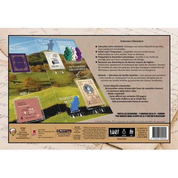 L’extension Personnages d’Obsession introduit dans le Derbyshire de nouvelles personnalités thématiques qui fournissent des actions uniques pour la gestion de votre domaine à la campagne : l’agent Bucket, qui a l’art d’éloigner toutes sortes d’invités peu recommandables, un certain M. Higbee, qui peut trouver de l’aide domestique en cas de besoin (« Des références ? Je suis sûr qu’elles sont ici quelque part… »), le sage révérend Grantly, qui dispense de sages conseils, et une marquise douairière excentrique, qui vous mettra en contact avec un major prussien, un noble suédois et un comte russe en un clin d’œil.