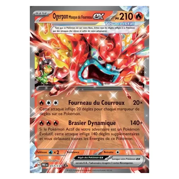 Découvrez Ogerpon Masque du Fourneau (pre017), une carte Pokémon de l’extension Évolutions Prismatiques, provenant du bloc Écarlate & Violet. Idéale pour compléter votre collection, cette carte Double Rare plaira autant aux collectionneurs qu’aux joueurs.