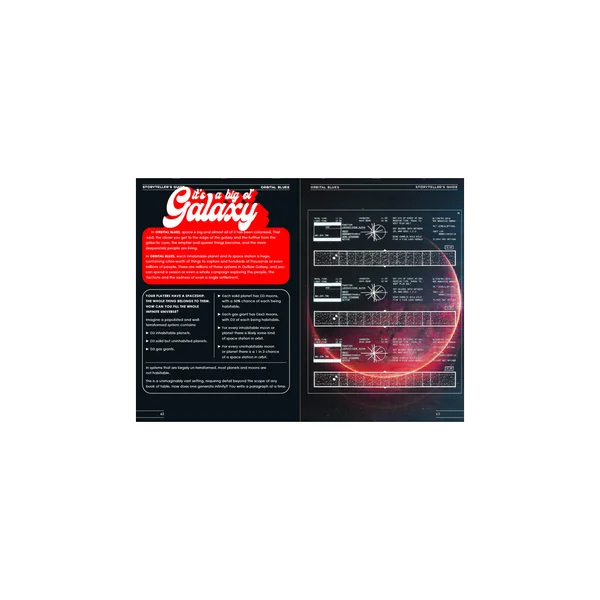 - Le Guide du Conteur : une boîte à outils variée pour mener des parties dans la Galaxie Hors-la-loi, avec des infos sur l’ingénierie spatiale, les voyages FTL, la génération de systèmes et de scénarios, ainsi que des règles optionnelles autour de la Chaleur et de la Joie.
