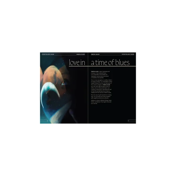 Orbital Blues est un jeu de rôle lo-fi western spatial publié par SoulMuppet Publishing, qui vous fait explorer les mondes rétros et poussiéreux de la Galaxie Hors-la-loi. Le jeu a été créé par Sam Sleney, Joshua Clark et Zachary Cox.