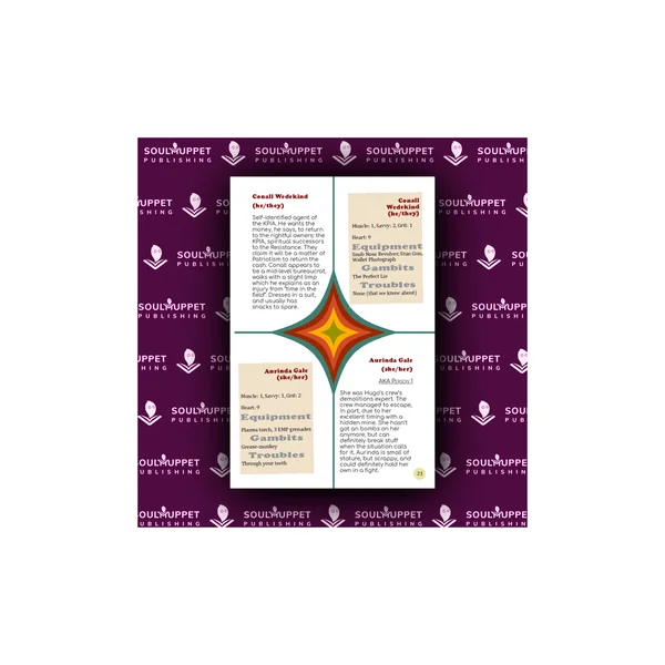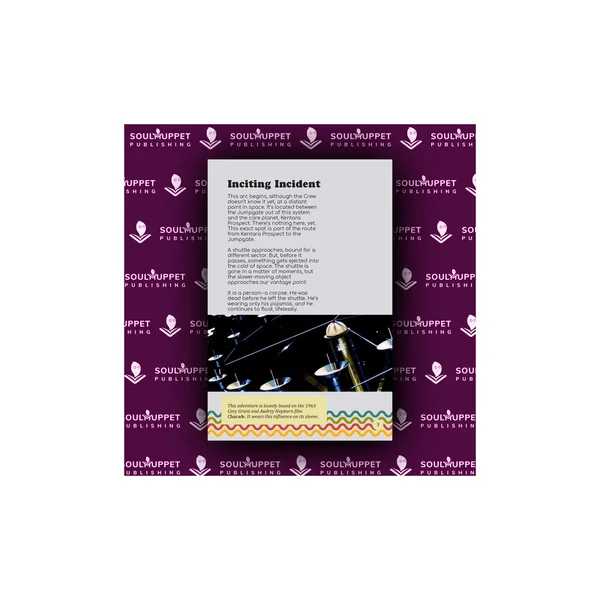 Lorsqu’un corps est abandonné dans l’espace entre Kentara Prospect et le saut spatial hors du système, une série d’événements étranges se déclenche pour Ainsley Pritchard, une nouvelle amie de l’équipage. Meurtres, argent et vieilles rancunes de guerre refont surface dans Jumpgate Charade. Inspiré du film Charade (1963) avec Cary Grant et Audrey Hepburn, ce module est conçu pour s’intégrer à n’importe quelle partie d’Orbital Blues.