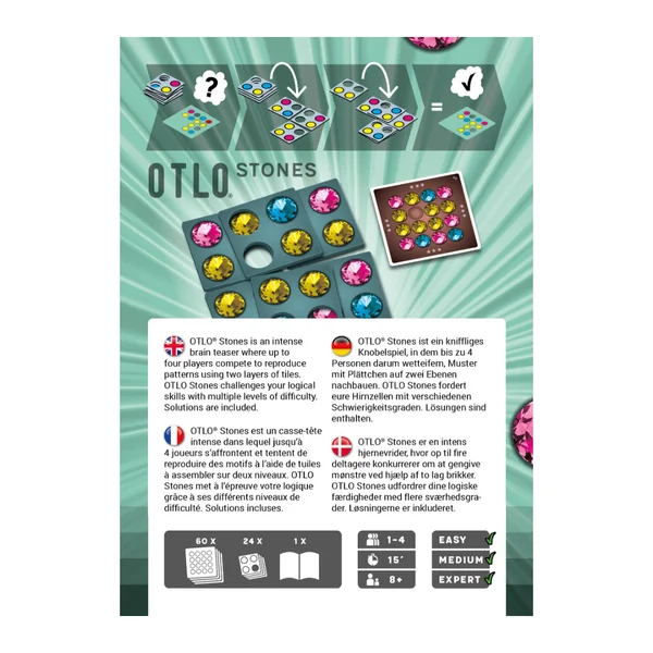 Chaque joueur dispose d’un jeu de six tuiles avec des pierres précieuses. Chacune de ces tuiles comporte également un ou deux emplacement vide, ce qui offre des options intéressantes lorsque l’on tente de recréer un motif de pierres précieuses sur une carte défi. Les tuiles sont disposées sur deux niveaux, ce qui permet aux symboles du niveau inférieur d’être visibles à travers les trous des tuiles du niveau supérieur.