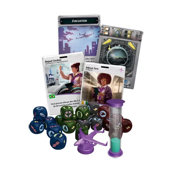 Ce jeu coopératif en temps réel, avec des lancers de dés, exige une coordination et une entente parfaites pour venir à bout des défis qui apparaissent sans cesse. Chaque joueur dispose d’un rôle spécifique, avec ses propres capacités. Il faut générer des ressources grâce aux dés, en s’assurant que les déchets ne dépassent pas la capacité de l’avion, qui sert de plateau central. Autour de ce cockpit qui accueille laboratoire de recherches, de production de vaccins et d’espaces de stockage, la piste des villes rappelle aux membres de l’équipe que le temps leur est compté. Le sablier s’écoule inexorablement !